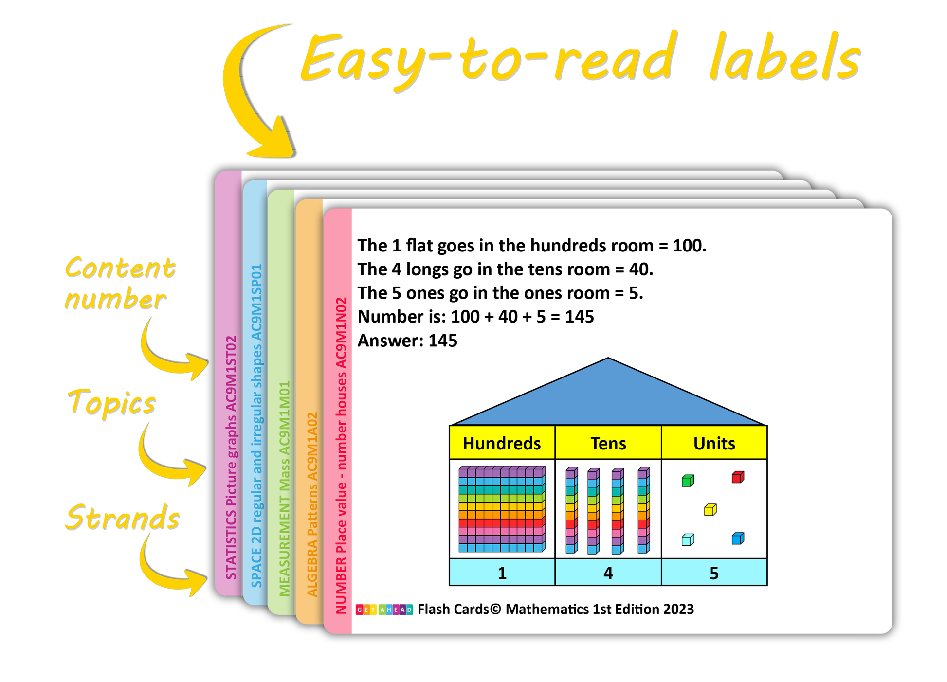 The flash cards cover five content strands including Number, Algebra, Measurement, Space and Statistics.*