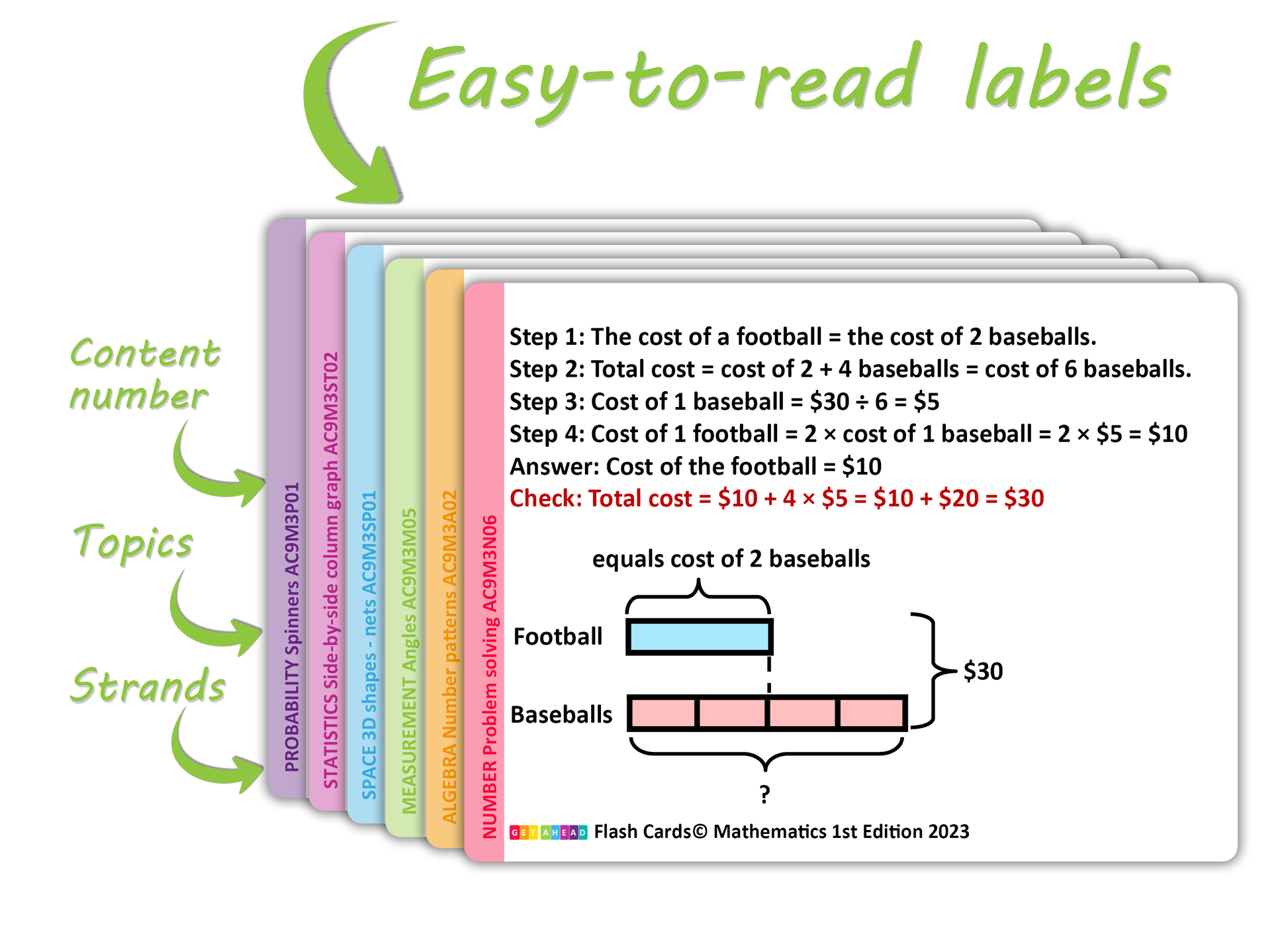 Each flash card features a colour-coded system which identifies the strand (e.g. Number), the topic (e.g. Fractions) and the content number (e.g. AC9M3N02).